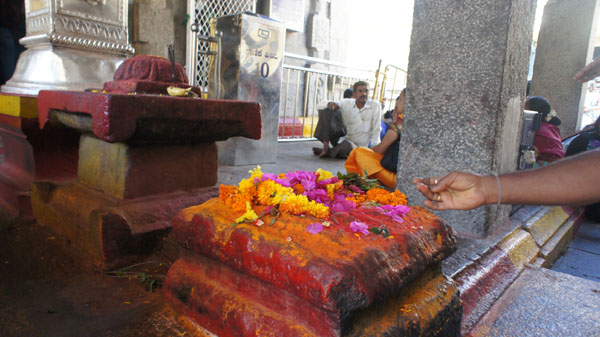 A hegyről gyalogosan ezer lépcsőn keresztül jutunk le. Útközben egy iskola mellett elhaladva gyönyörű panoráma tárul elénk a városra, láthatjuk a lóversenypályát, a Lalita Mahal palotát, a Mysore palotát és a város legszebb tavát, a Kukkarahallit. A nyolcszázadik lépcső magasságában egy apró Shiva templomnál vehetünk menedéket, vele szemben pedig egy hatalmas gránit Nandi (Shiva szent bikája) szobrot helyeztek el (mely 24 láb hosszú és 15 láb magas), bronz csengőkkel a nyakában. A lefelé vezető úton, és a Chamundeshwari templomnál is számolnunk kell a majomcsaládok kíséretével, s néha azzal is, hogy megpróbálnak elcsenni ezt-azt a turistáktól.