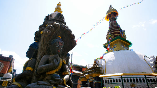 Megtekintjük Nepál szimbólumává vált Swayambunath stupát, ami egy dombon található, és ahova meredek lépcsőkön juthatunk fel, de kárpótol a kathmandui panoráma, a környező hegyek, a hófehér kupolájú stupa és a végtelennek tűnő buddhista zászlók látványa. Pár lépcsőn keresztül átjutunk Manjushri Majom isten templomához is.