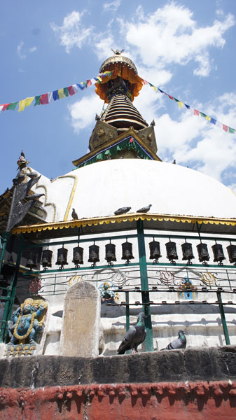 Megtekintjük Nepál szimbólumává vált Swayambunath stupát, ami egy dombon található, és ahova meredek lépcsőkön juthatunk fel, de kárpótol a kathmandui panoráma, a környező hegyek, a hófehér kupolájú stupa és a végtelennek tűnő buddhista zászlók látványa. Pár lépcsőn keresztül átjutunk Manjushri Majom isten templomához is.